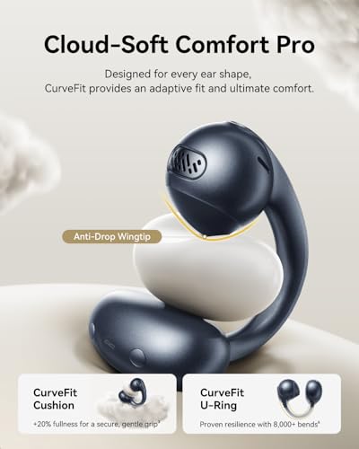All-Day Clip-On Comfort: The open-ring clip earbuds feature ultra-soft, resilient CurveFit cushions, anti-drop wingtips, and a flexible TPU U-ring with memory titanium wire tested for 8,000+ bends. At just 5g, these open-ear earbuds are designed to offer a breathable, adaptive, secure fit with cloud-like comfort for various ear shapes without irritation and pressure